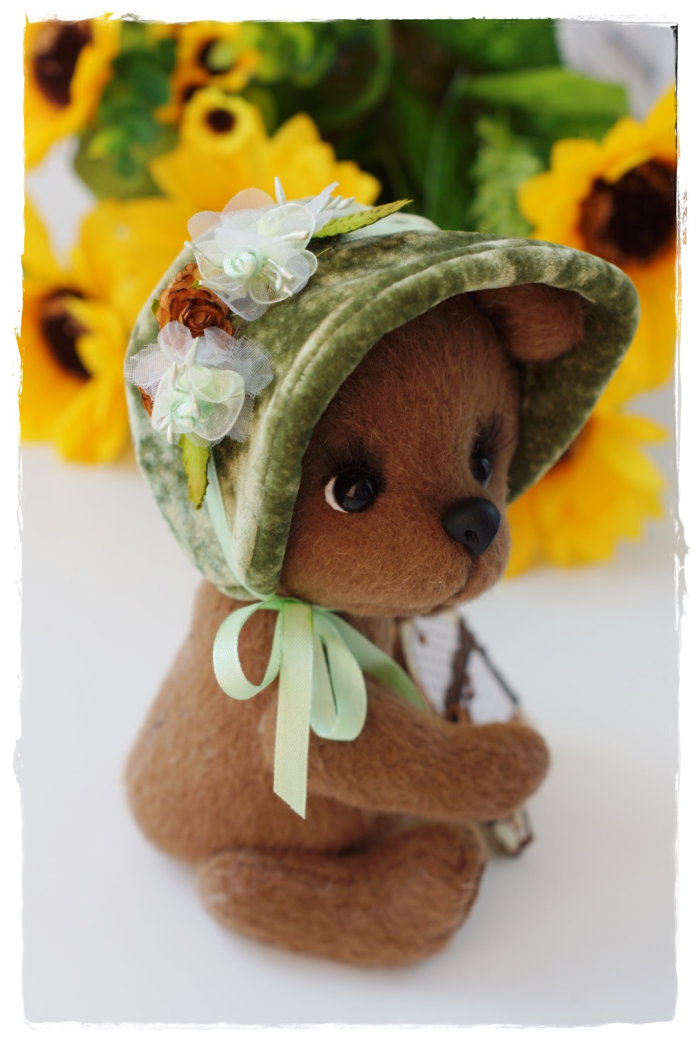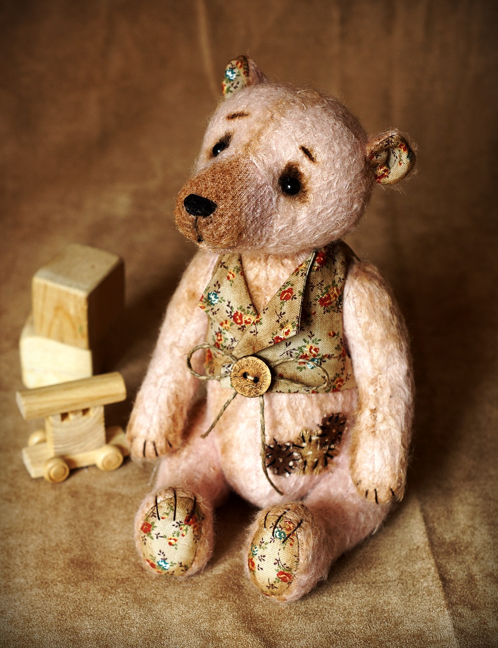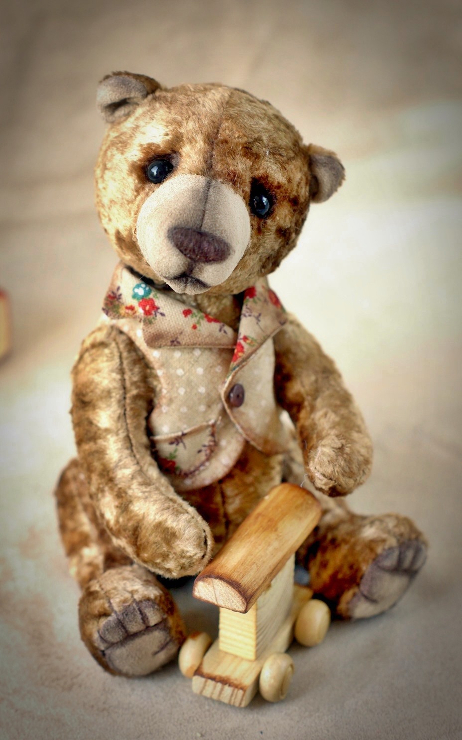 Буба выполнен из вискозы, 5 шплинтовое крепление, набит опилочками и синтепухом. Умеет только сидеть.Тонирован кофе, маслом. Мой Мишка с любовью, взялся его поправлять и так нежно , что не могла удержаться... :))) На фото руки его... малюсенькие... поэтому медведь кажется большим:)))