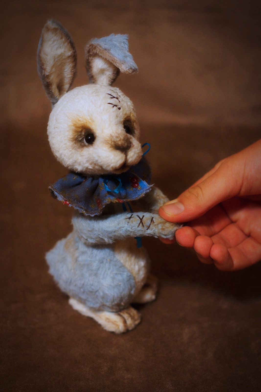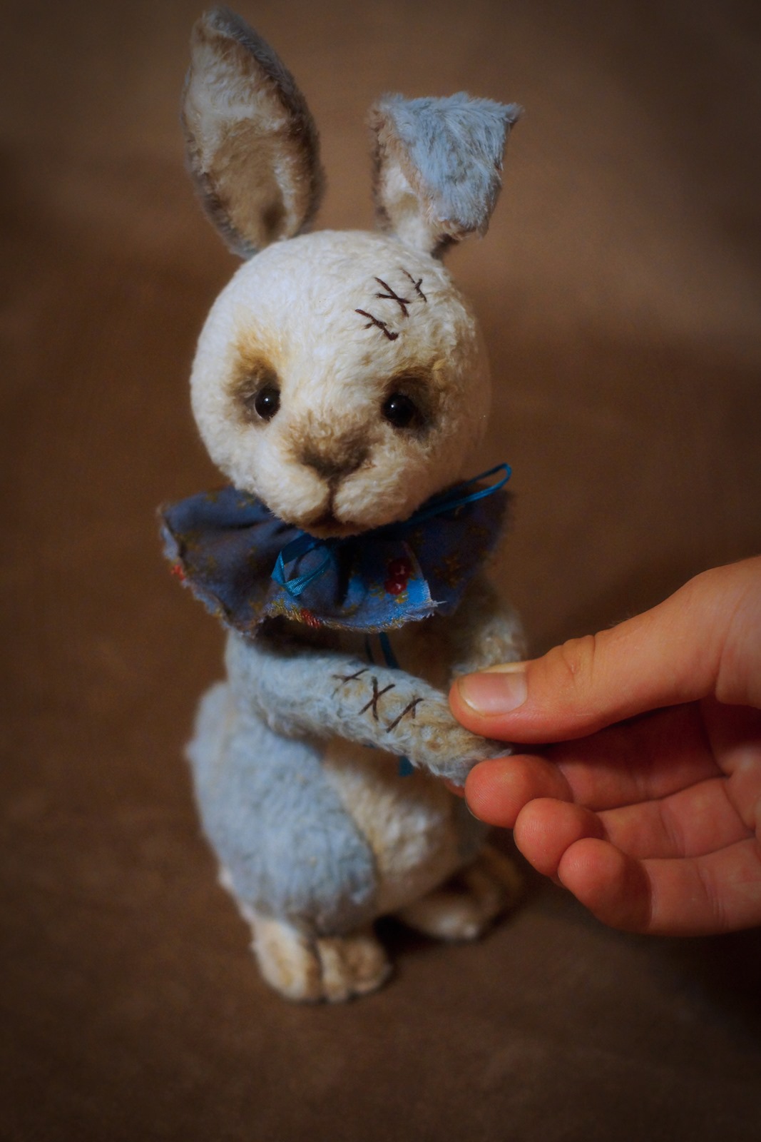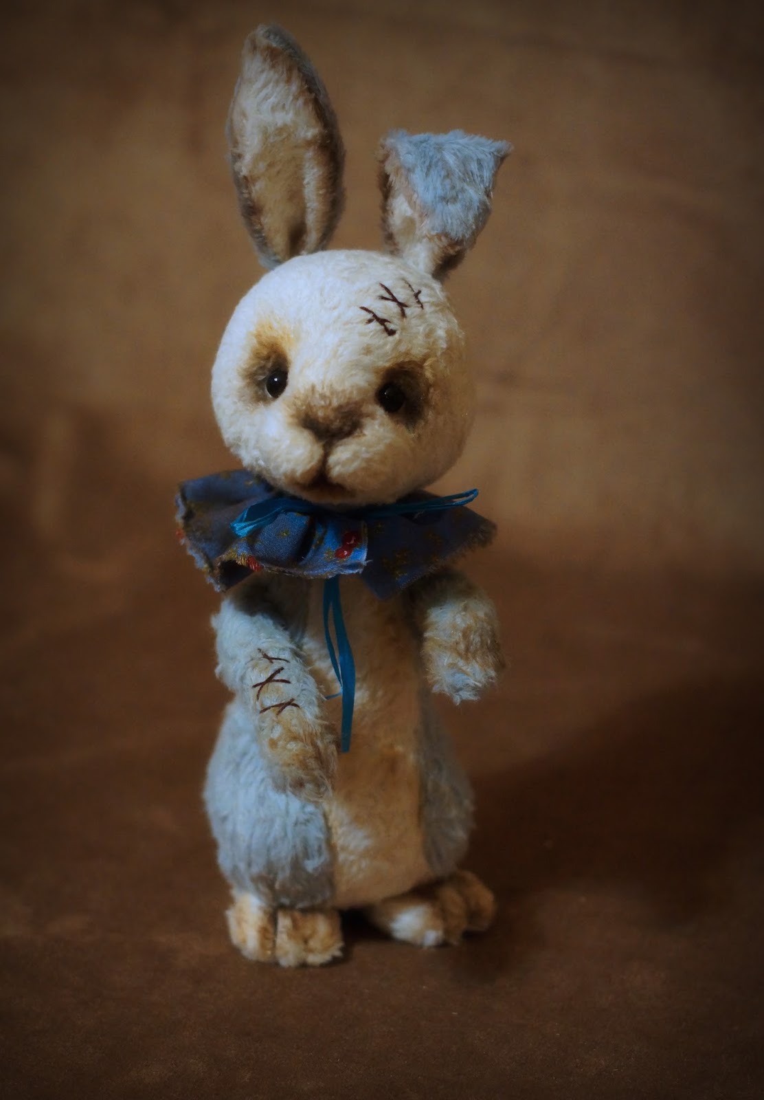 Сшит из мохера, состарен, 5 шплинтов, набит опилками и синтепухом.