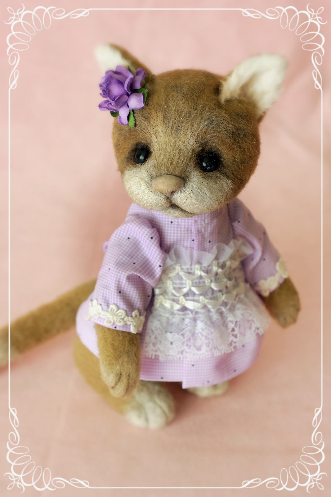Долго томилась она у меня на полке..... Сначала сделала моську.... моська ждала тело... как тело сделала , не хватило материала на лапку..пришлось искать по магазинам. Тянучка... одним словом... А моська лежала и упорно ждала, когда я все соберу в кучу.. В итоге.... получилась кися.... Такая скромная,нежная, уютная девочка... :) не знаю , как вам...а мне она нравится:)))